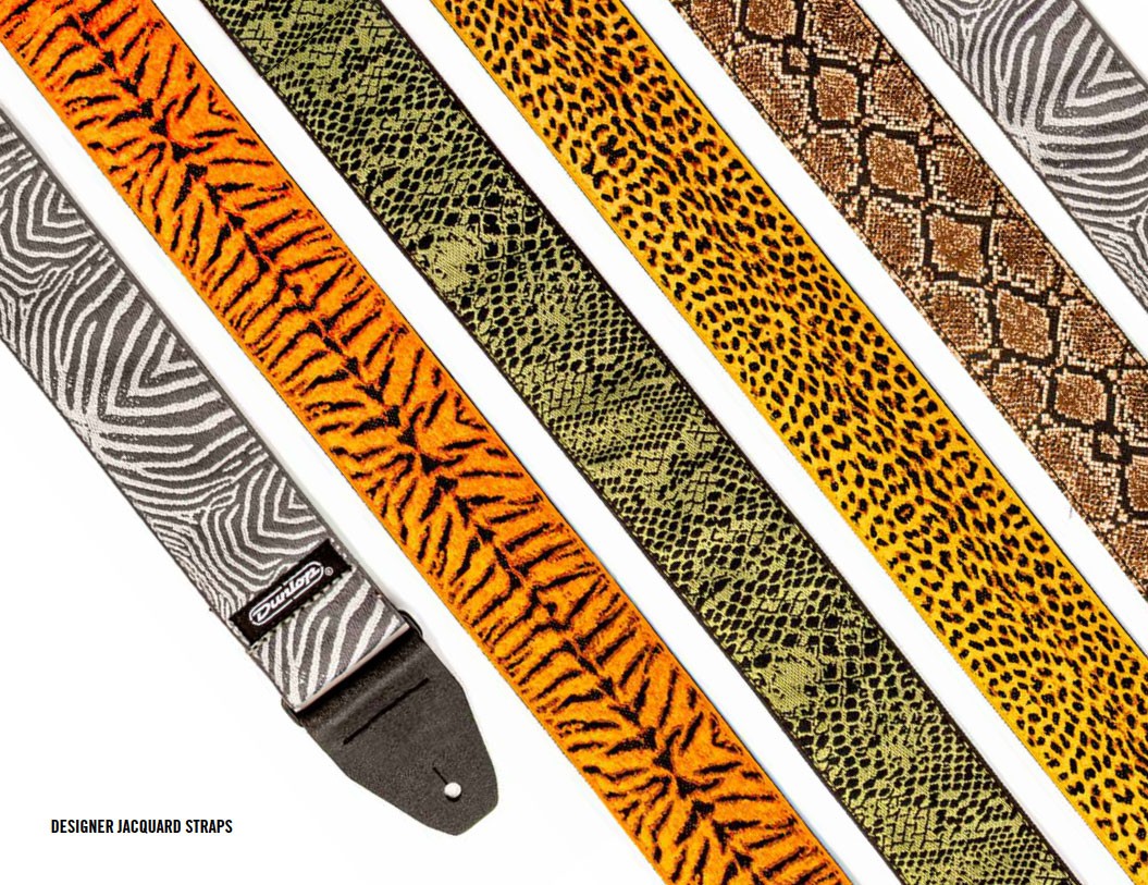 Дизайнерські жакардові ремені виготовлені зі зручної, високоякісної тканини з яскравими, барвистими візерунками, розробленими власними художниками Dunlop. Кожен ремінь витримує навантаження до 90 кілограм і має наконечники з натуральної шкіри, призначені для використання з системою фіксації Straplok або без неї. У 2025 році Dunlop додали до лінійки шість нових стильних дизайнів.