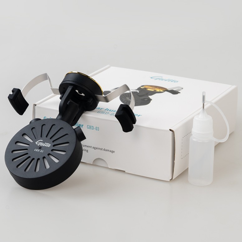 Більшість гітарних зволожувачів розміщуються між гітарними струнами, створюючи додатковий тиск на них. Таке розміщення створює додаткову напругу й на гриф гітари, адже натяг струн постійно збільшений. Щоб вирішити цю проблему і щоразу не спускати струни, Guitto розробили нову модель гітарного зволожувача GHD-03 – геніальне й водночас просте рішення – зволожувач та вологомір з фіксацією на самій розетці гітари!
