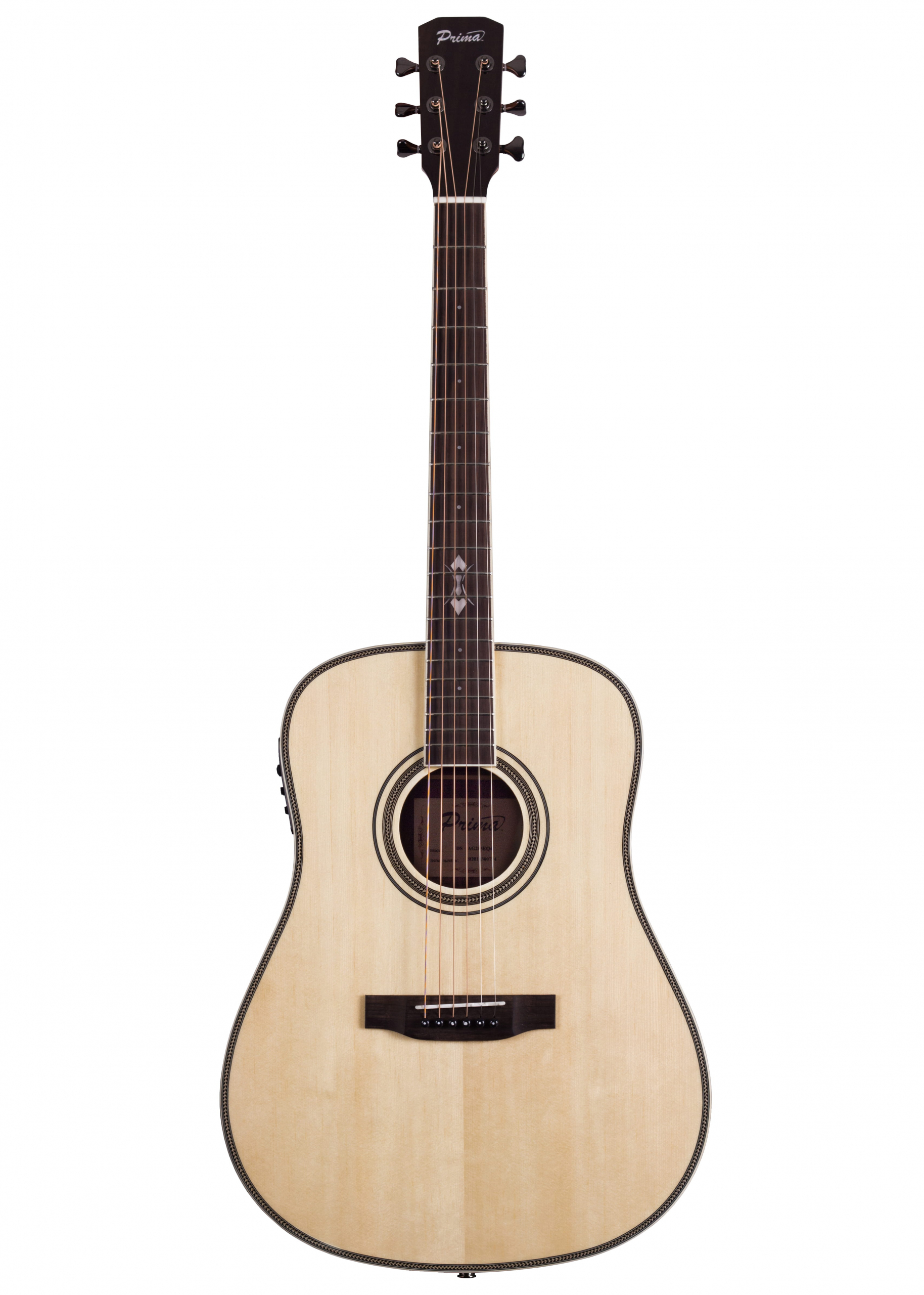 Prima MAG205Q – акустична гітара глибокої форми дредноут з палісандровим корпусом та ялиновим топом. Кремові облямівки по довжині грифа та на п'яті, облямування з детальним візерунком, що оперізують корпус та отвір резонатора. Стильно зрізані кути голови грифа, кілки кольору чорного хрому з вишуканою формою ручок, шпон палісандра на голові грифа та унікальна інкрустація на накладці грифа - гітара просто створена для того, щоб приносити власникові естетичне задоволення.