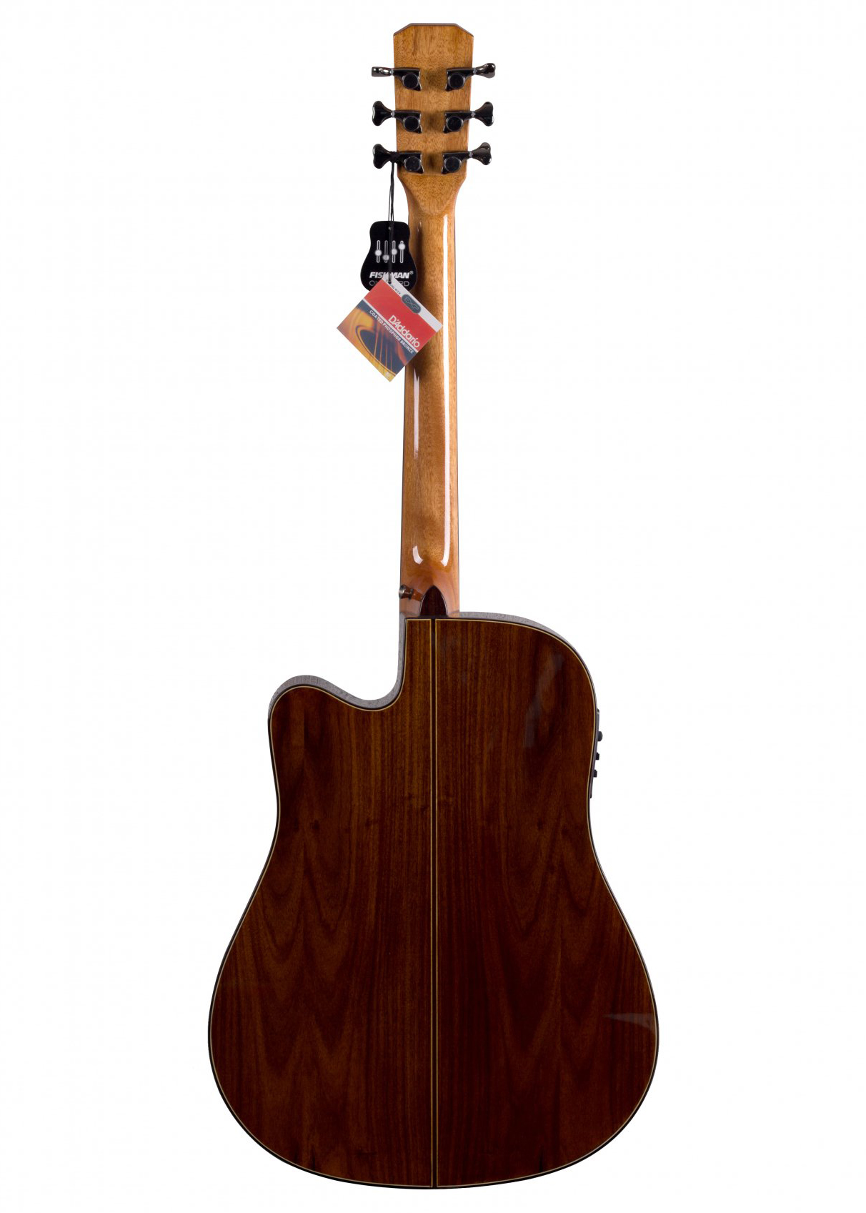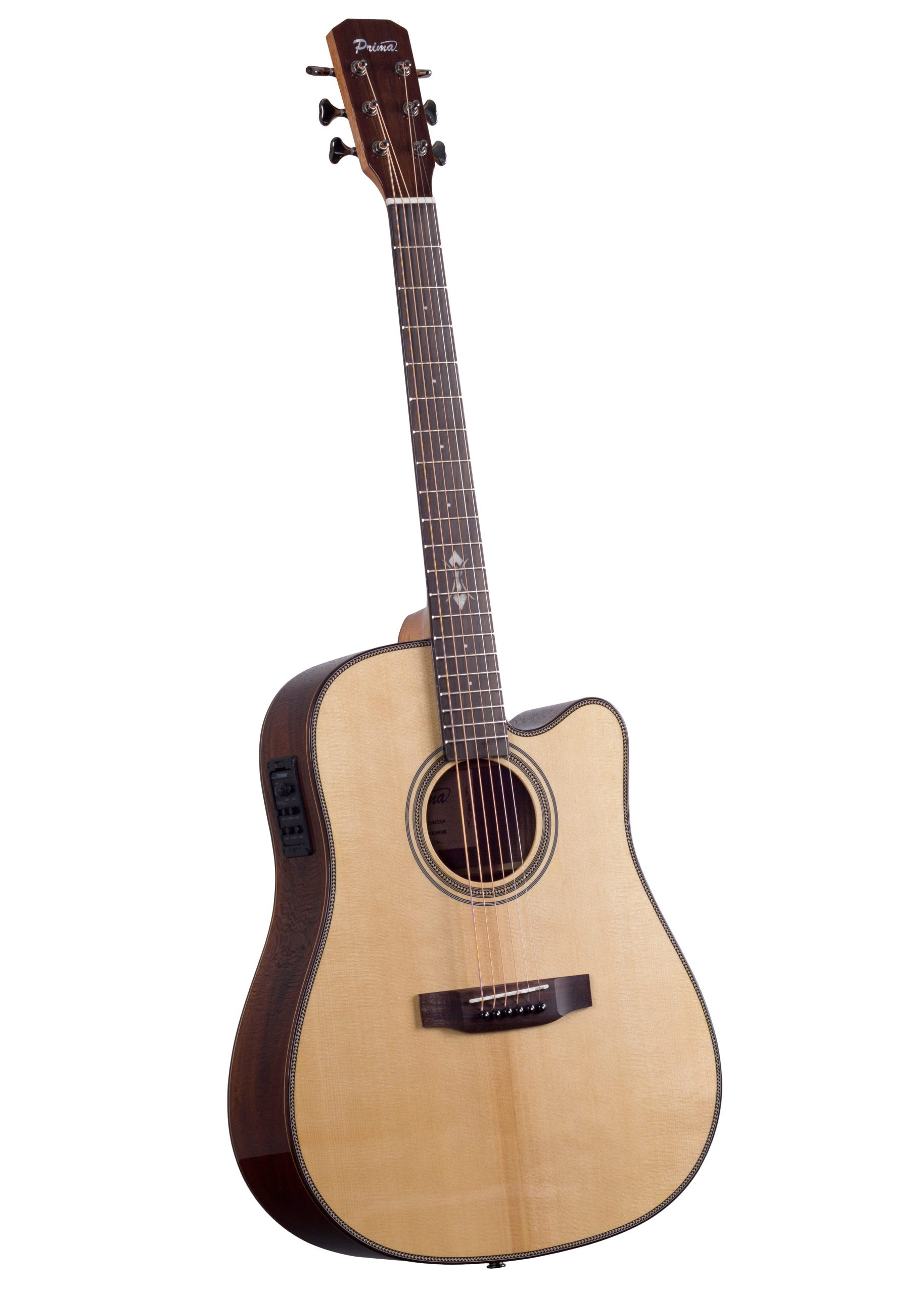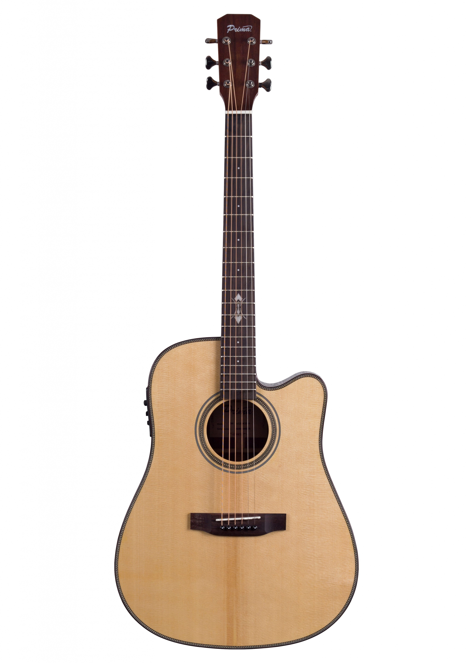 Prima MAG218cQ – акустична гітара глибокої форми дредноут з корпусом з ламінованого пау ферро та цільним ялиновим топом. Має блямування з детальним візерунком, що оперізують корпус та отвір резонатора. Стильно зрізані кути голови грифа, кілки кольору чорного хрому з вишуканою формою ручок, шпон палісандра на голові грифа та унікальна інкрустація на накладці грифа - гітара просто створена для того, щоб приносити власникові естетичне задоволення.