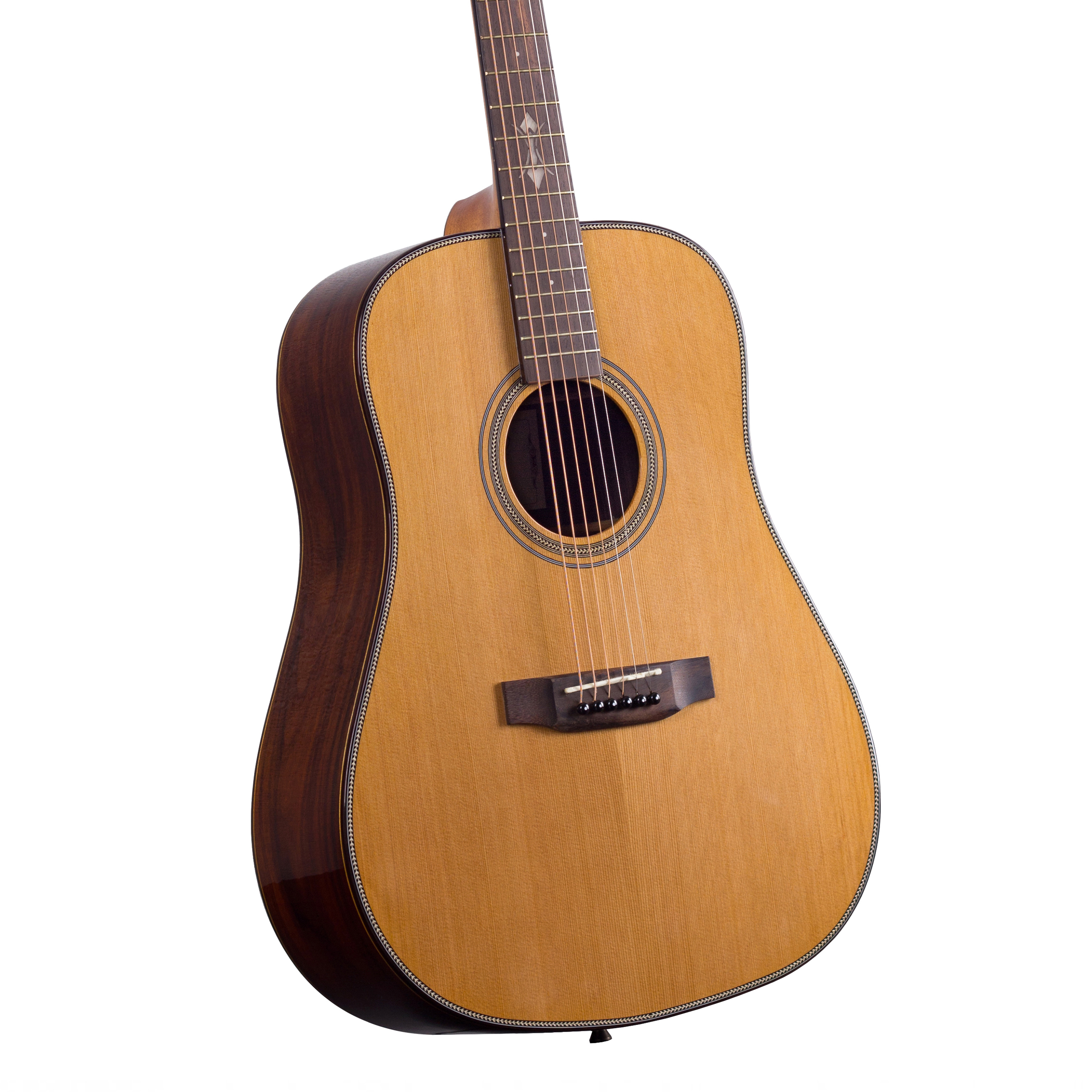 Prima MAG219 – акустична гітара глибокої форми дредноут з корпусом з ламінованого пау ферро та цільним кедровим топом. Має блямування з детальним візерунком, що оперізують корпус та отвір резонатора. Стильно зрізані кути голови грифа, кілки кольору чорного хрому з вишуканою формою ручок, шпон палісандра на голові грифа та унікальна інкрустація на накладці грифа - гітара просто створена для того, щоб приносити власникові естетичне задоволення.