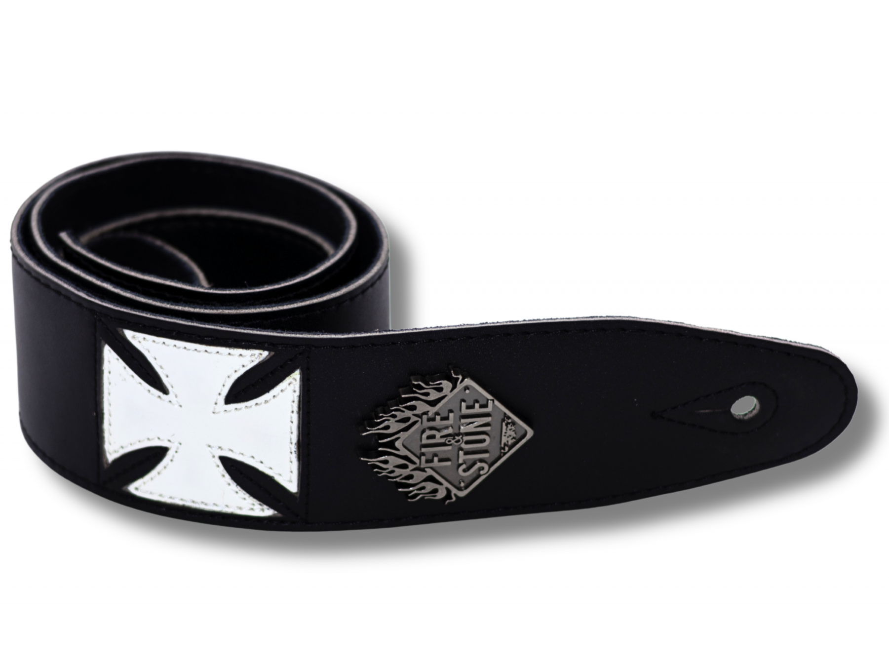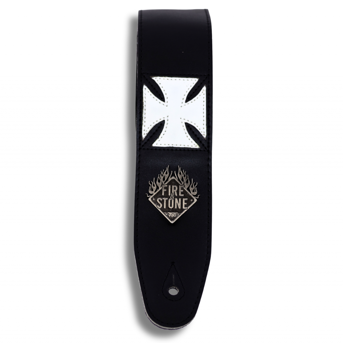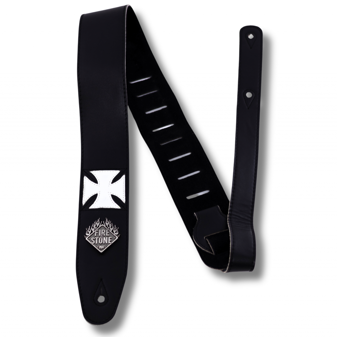 Ремінь зі штучної шкіри з замшевою підкладкою. На фронтальній частині присутній білий пришитий хрест зі шкірзамінника та металевий логотип Fire&Stone. Безперервний боковий шов, регульована довжина та отвір для ґудзика з посиленим швом.