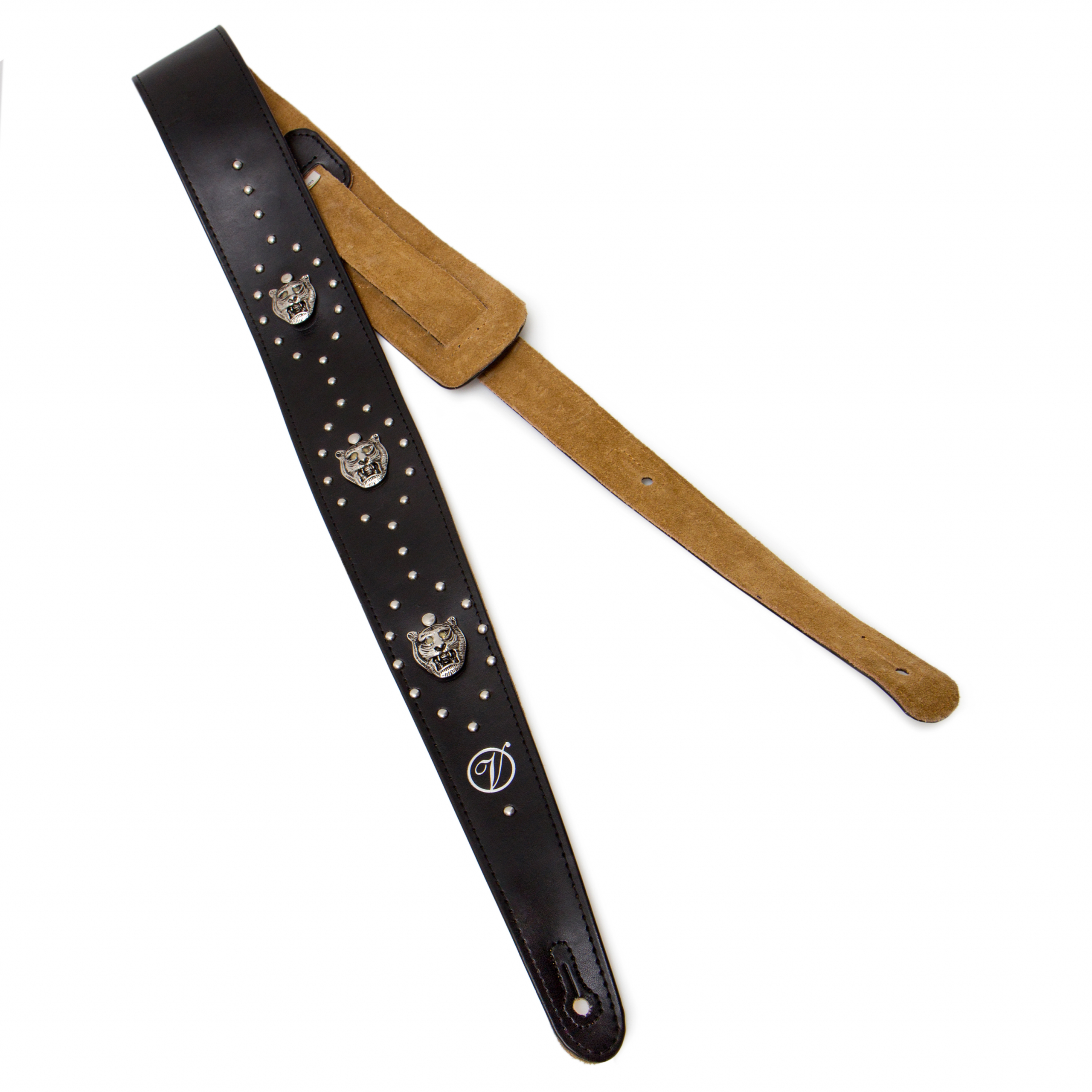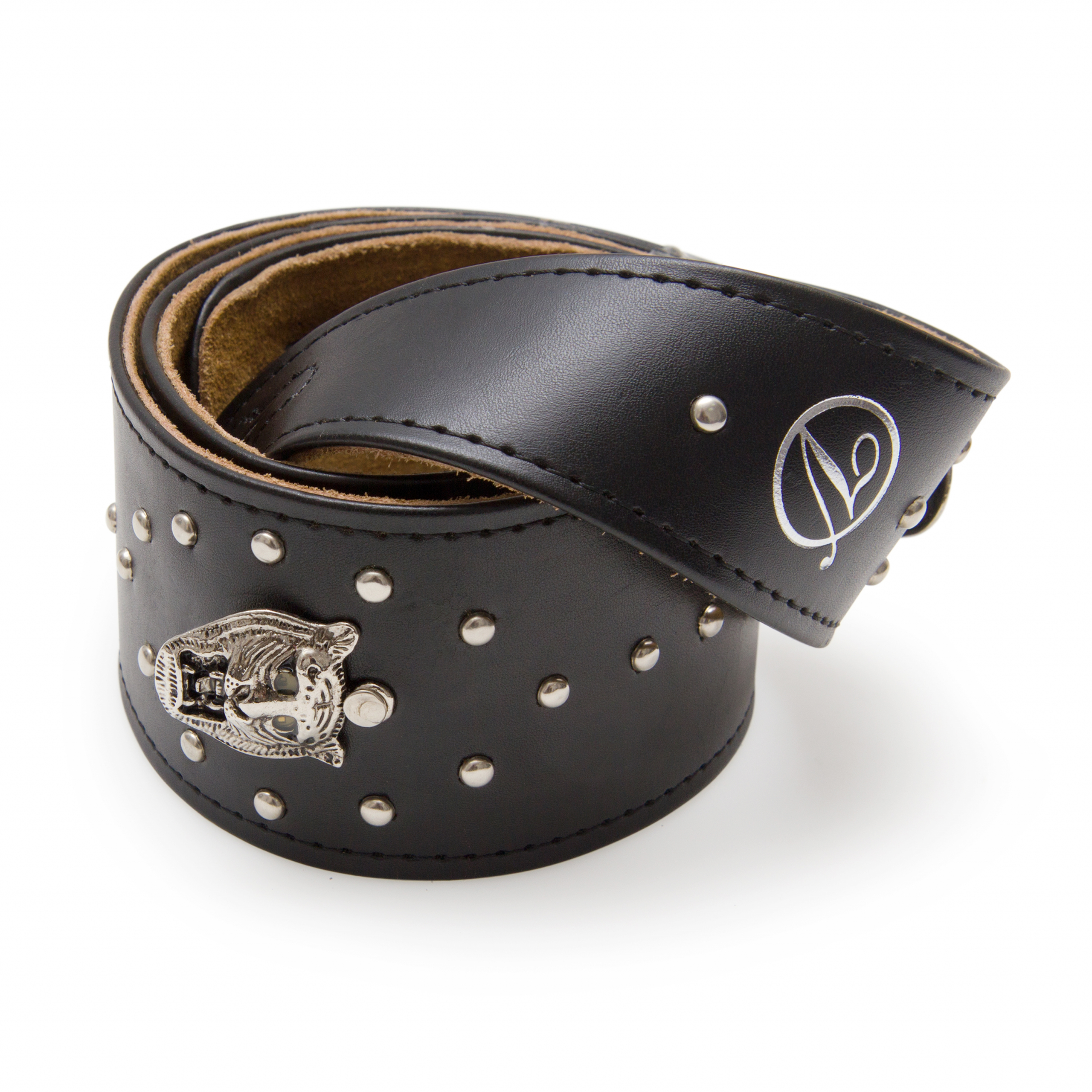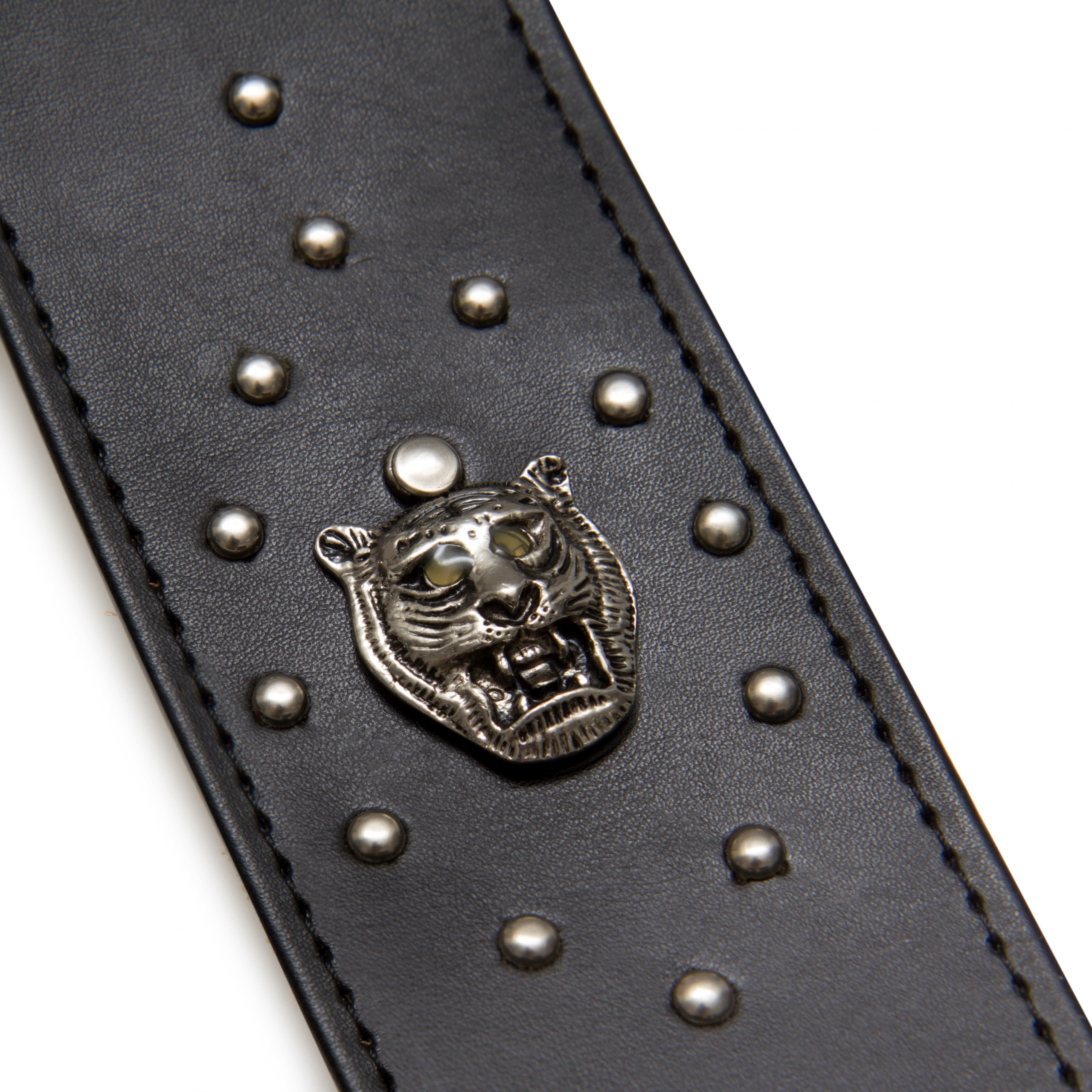 Ремінь для гітари зі штучної шкіри з підкладкою з замші. Декорований металевими заклепками та металевими головами тигрів, що можуть світитись при встановленні у кожну 3-х батарейок LR41. Аксесуар для експресивних гітаристів!