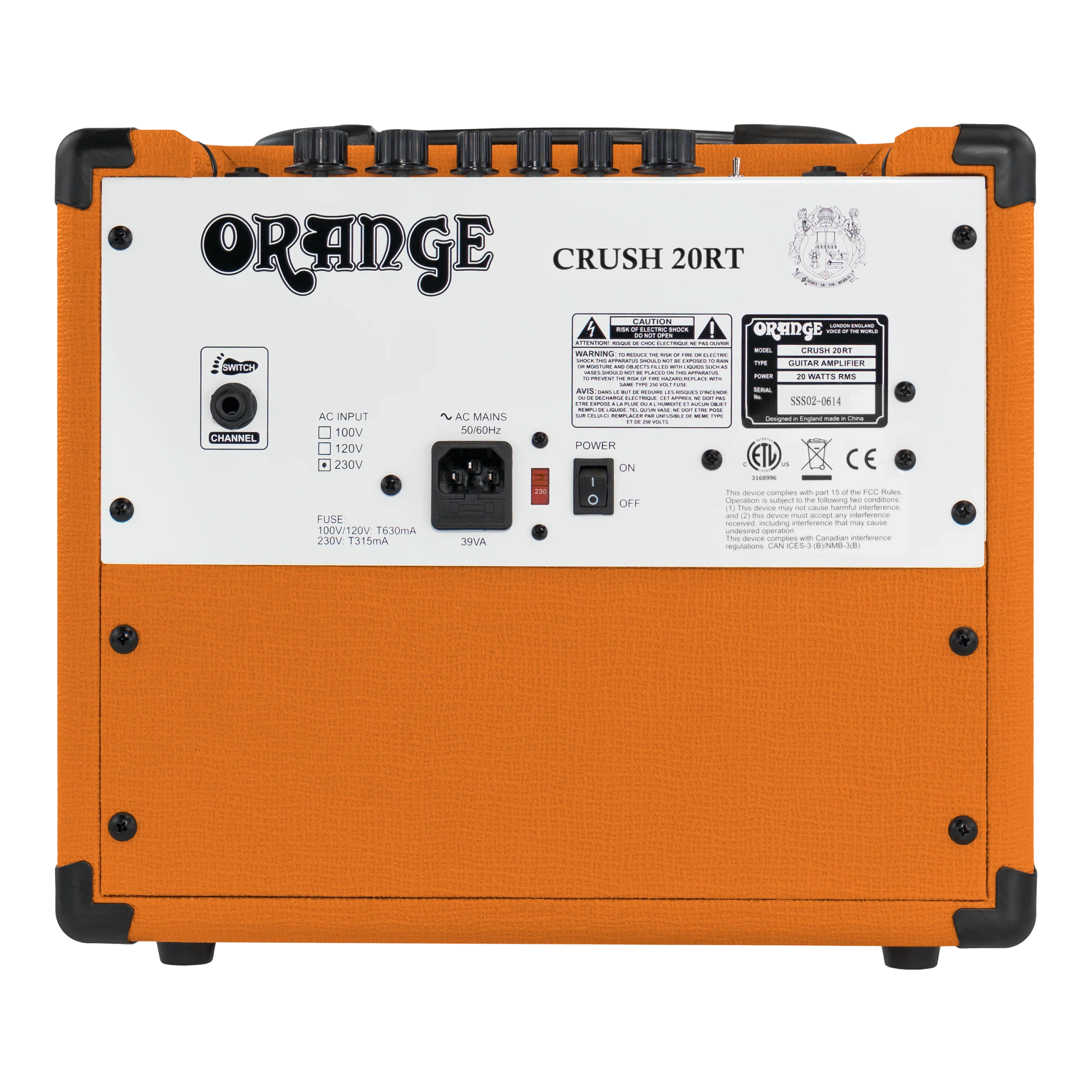 Crush 20RT побудований на тональній платформі Crush 20, тепер зі ще більшою функціональністю завдяки вбудованому ревербератору і хроматичному тюнеру. Як і його більш "стриманий" брат, Crush 20RT має канали Clean і Dirty, що можна перемикати футконтролером, а також новий хай-ґейн чотирикаскадний передпідсилювач від Orange, що забезпечує величезну палітру овердрайв і перевантажених тембрів, багатих на гармонійні обертони.