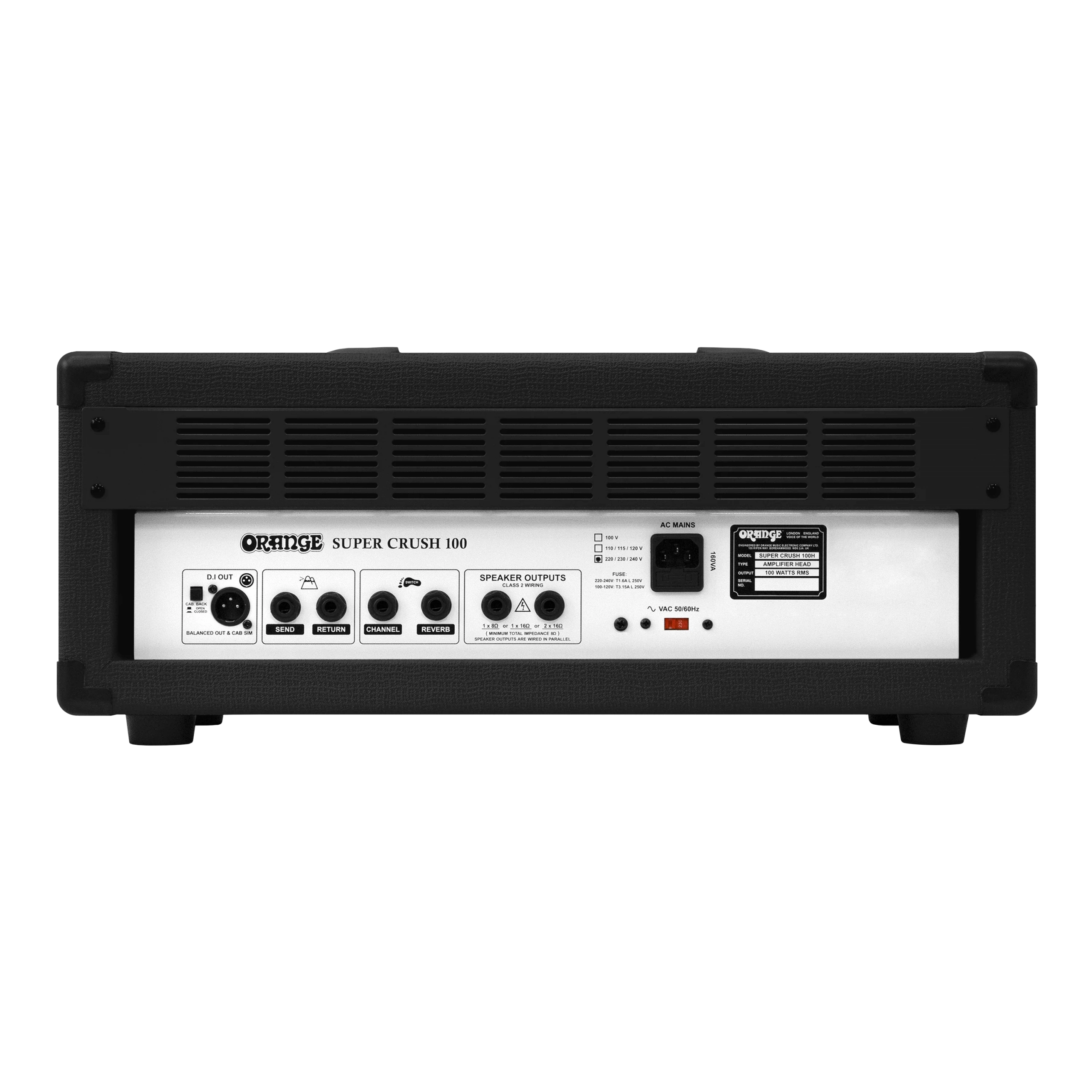 Завдяки односторонньому двоканальному JFET преампу і 100-ватному підсилювачу класу A/B Super Crush 100 імітує величезний, багатий і чуйний тембр флагманських підсилювачів Orange Rockerverb в твердотільному виконанні. Від чистого звуку до важкого хай-ґейну, в ньому не бракує "помаранчевого моджо". Чутлива до дотику динаміка і пишні гармонійні обертони співають з цього підсилювача з такою силою і музичністю, що ви можете заприсягтися, що всередині нього є лампи!