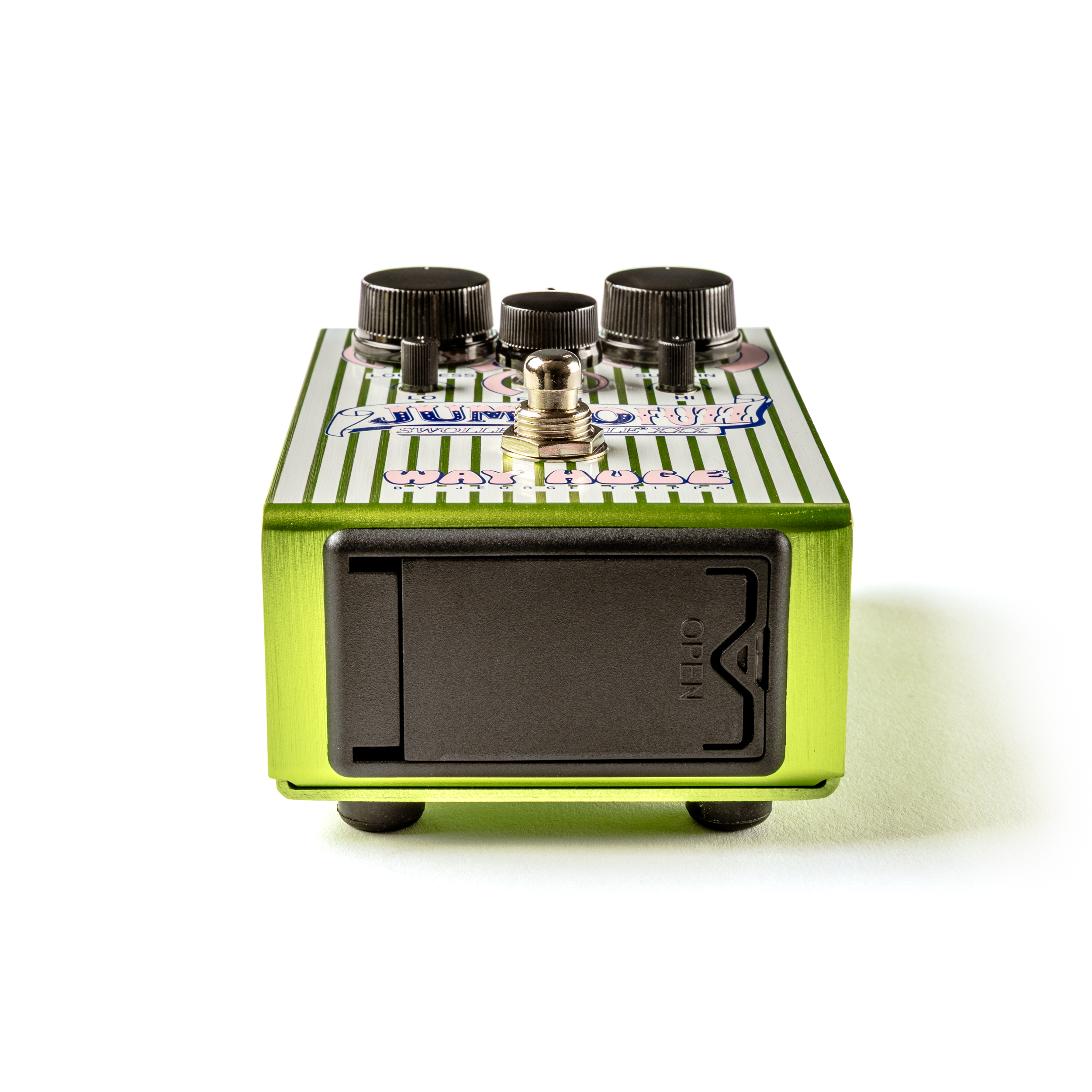 По-перше, він замінив традиційну транзисторну схему на хай-гейн дискретні транзистори для ще більшої «волохатості». Далі він замінив ручку Crunch на тумблер, щоб налаштування компресії відбувалися блискавично. Нарешті, Містер Х’юдж повністю переробив темброблок (tone stack): нові регулятори Hi та Lo формують високі та низькі частоти фільтра, тоді як внутрішні перемикачі дозволяють музикантам кастомізувати саму криву частот - від пласкої до ультра-вирізаної або максимально піднятої. Це дає вам безпрецедентний контроль над голосом цього «зухвалого огірка».