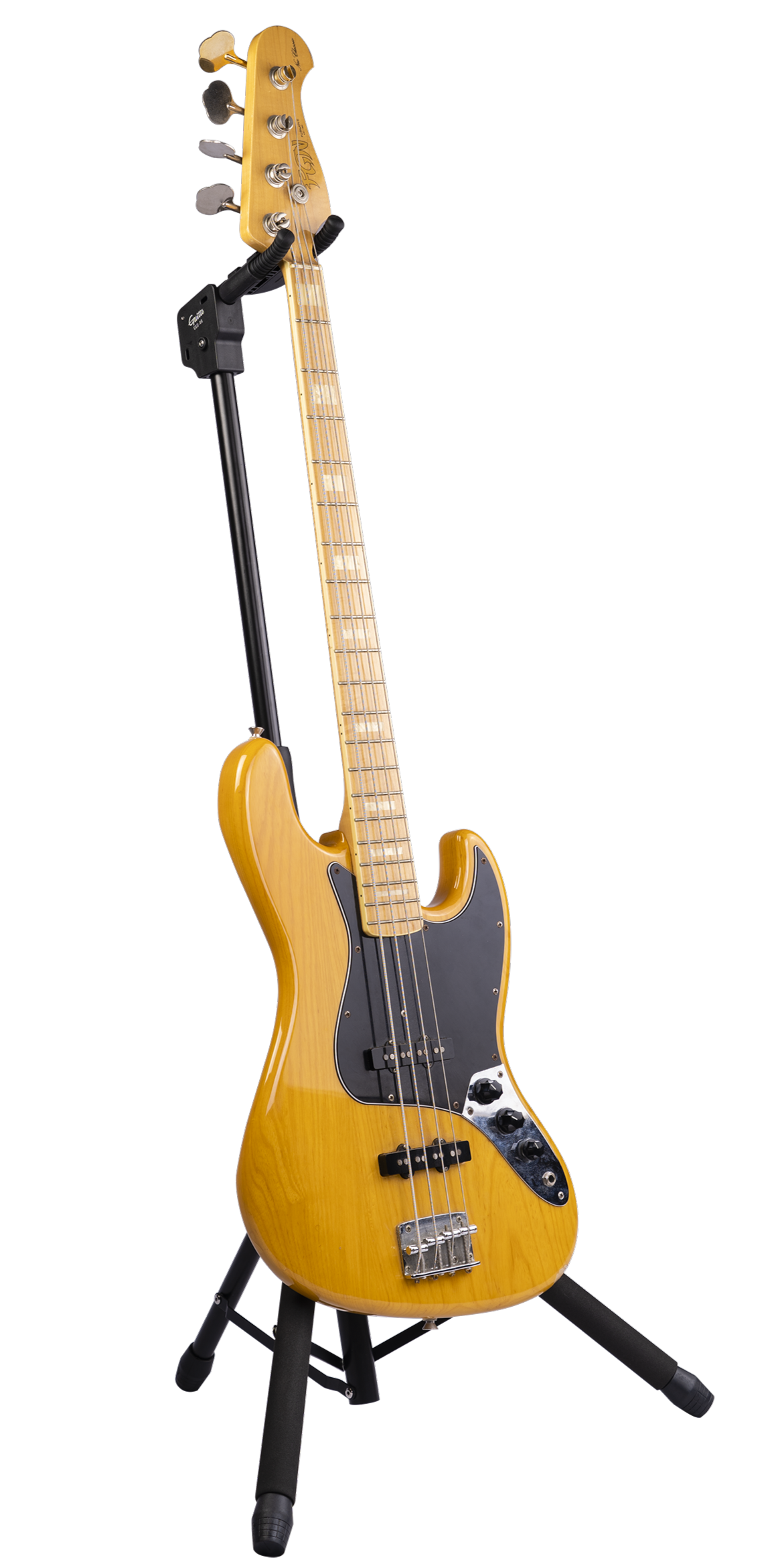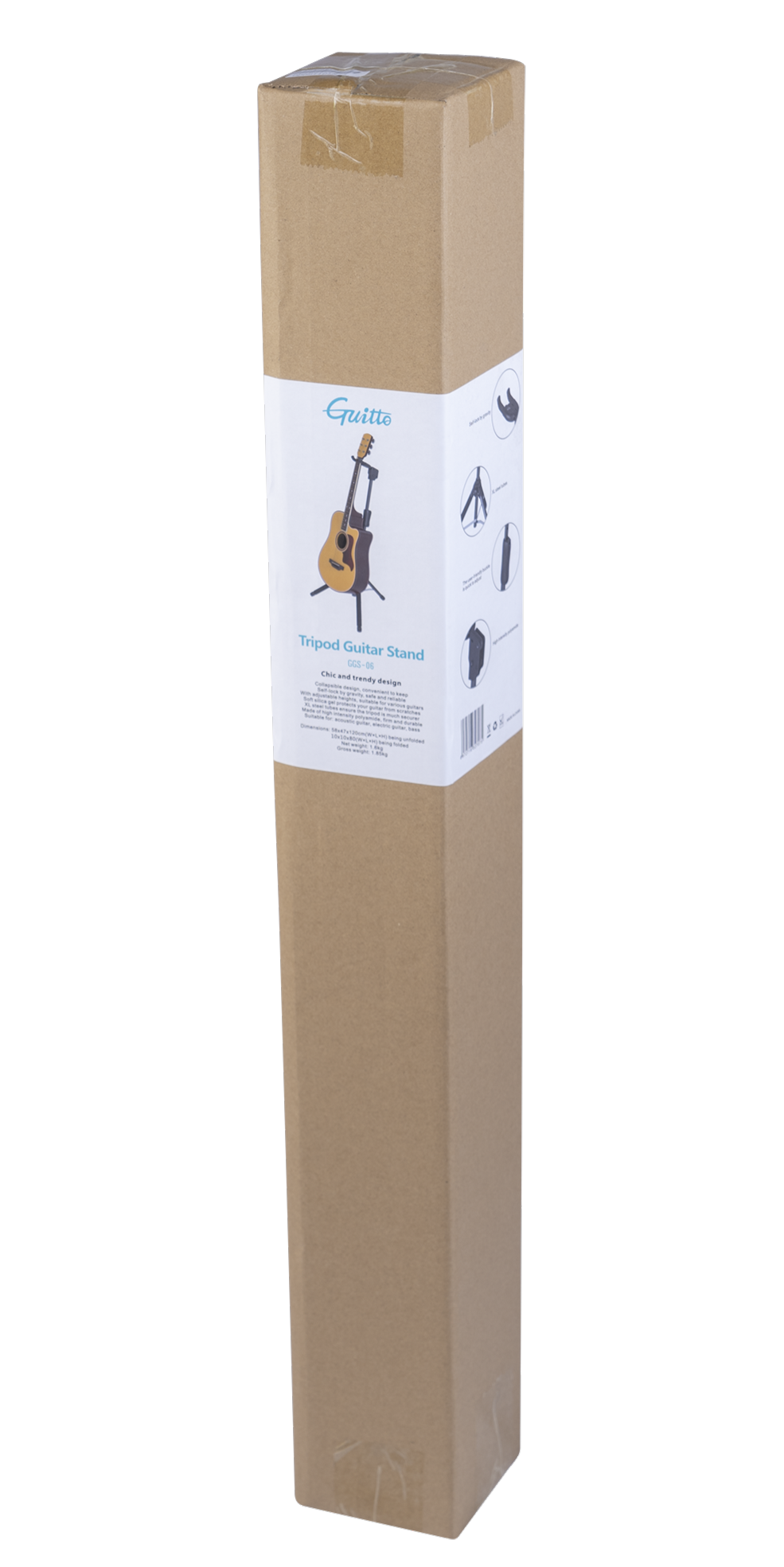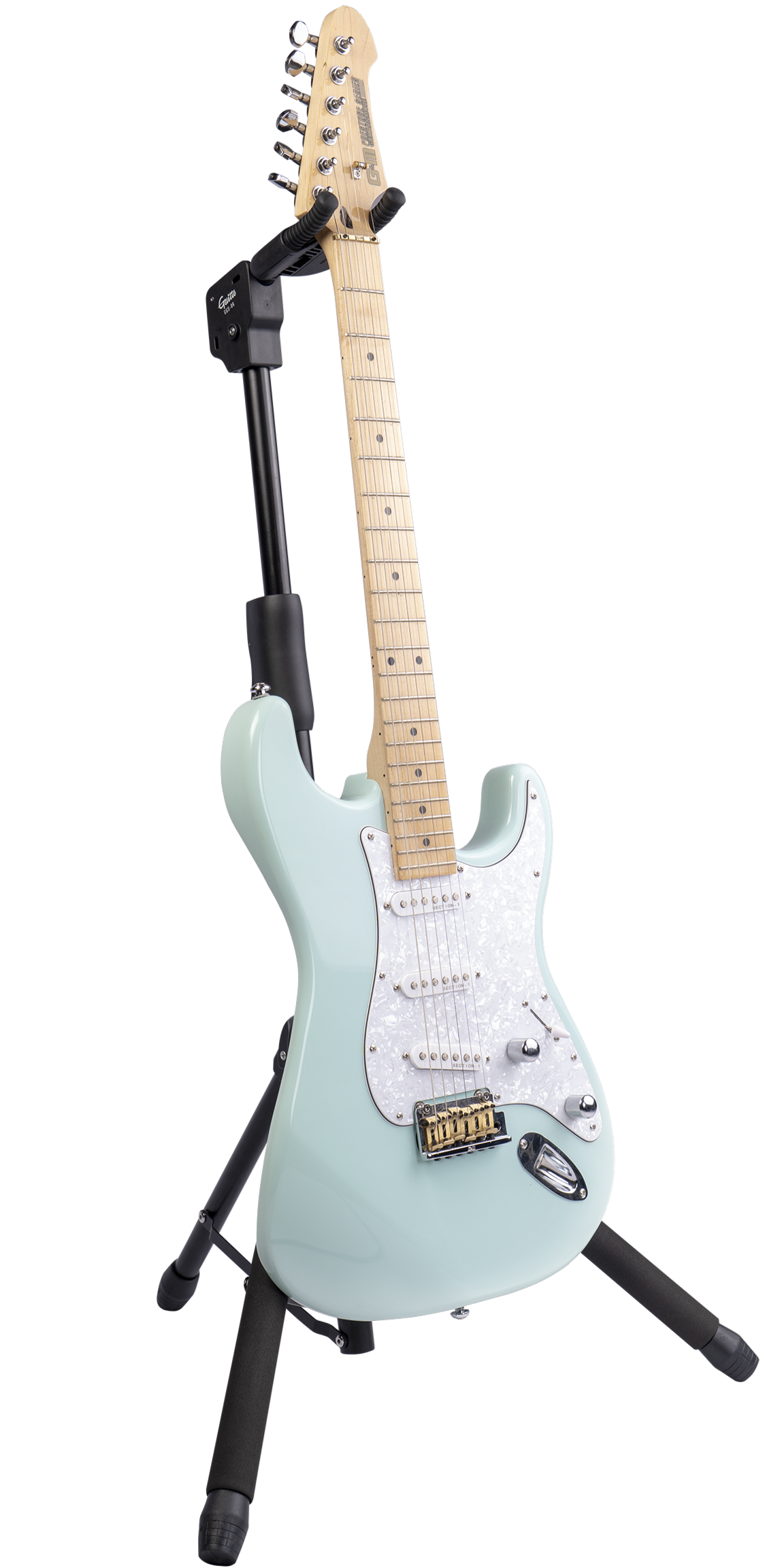 Стійка виготовлена з поліаміду, з високоміцними болтами та металевими частинами, це значно підвищує його несучу здатність. Ніжки покриті силікагелевою оболонкою, що захищає гітару від пошкоджень. "Роги" тримача загнуті вгору, щоб захистити інструмент від зковзування. Зручний механізм регулювання висоти.