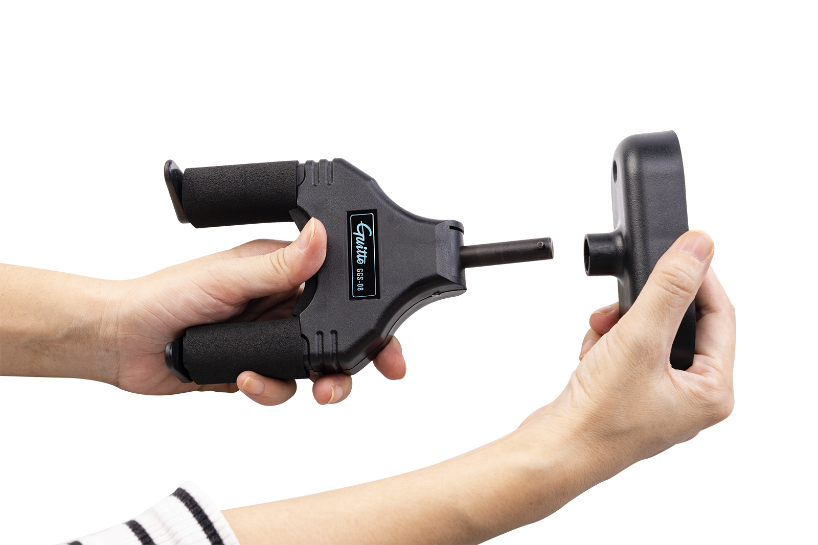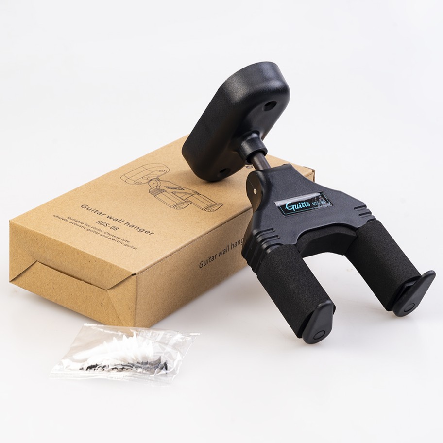 Guitto GGS-08 – гітарний гак для кріплення інструмента на стіну, обладнаний спеціальним механізмом замикання. Конструкція автоматично закриває ворітця та адаптується під вагою акустичної гітари, електрогітари, бас-гітари чи укулеле, що дозволяє досягнути надійної фіксації та сумісності з різноманітними формами голови грифа.
