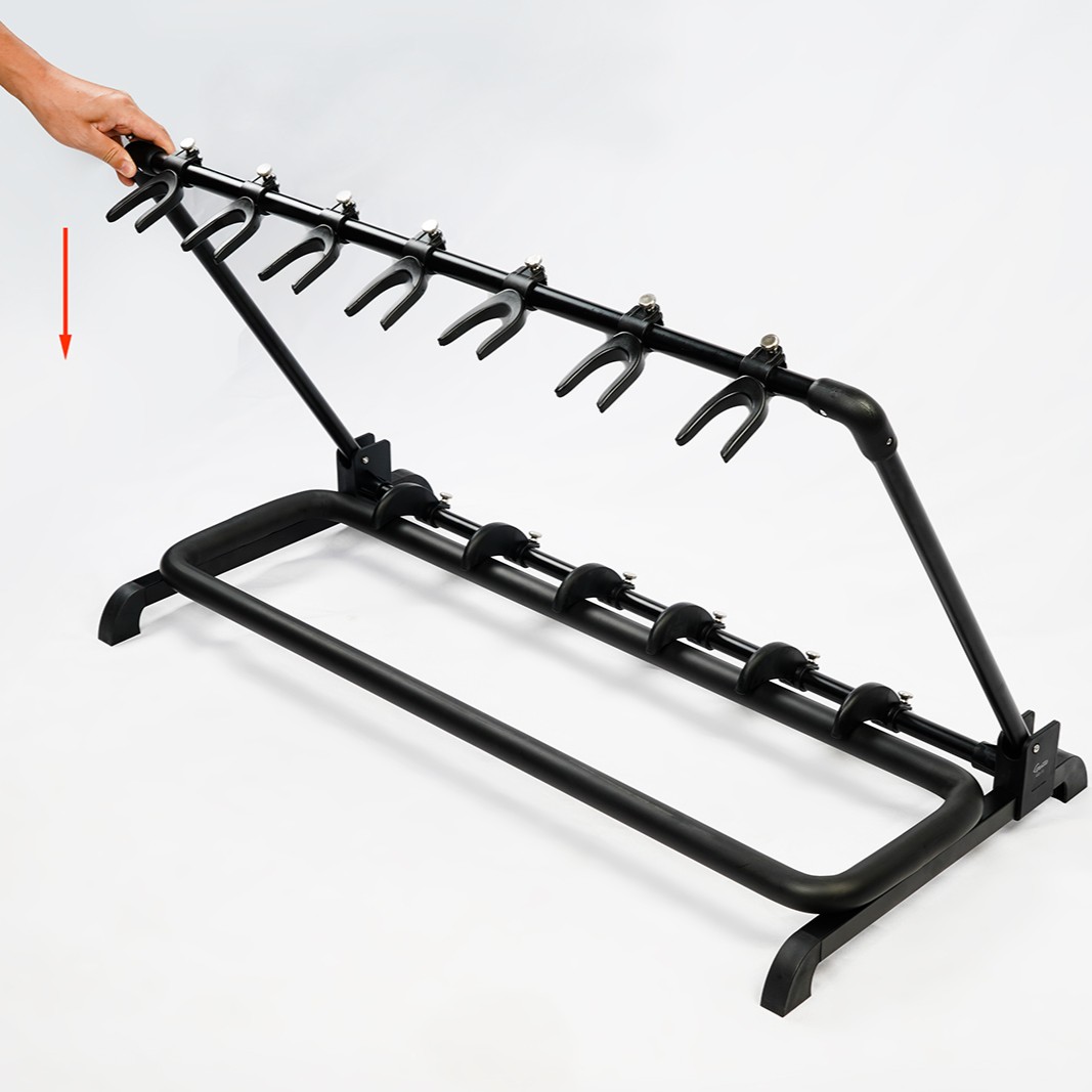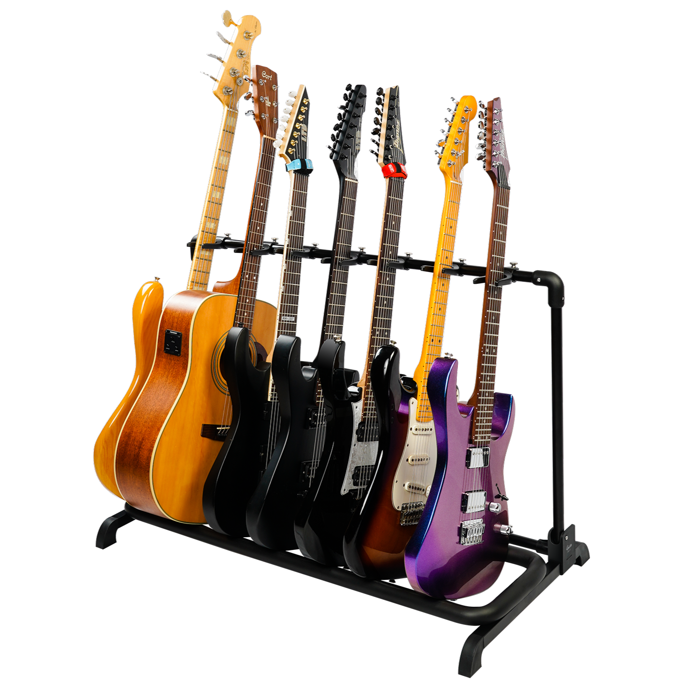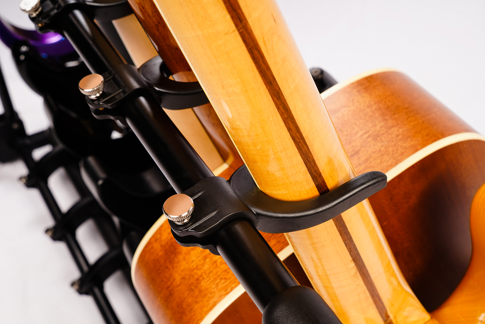 Стійка для гітар Guitto GGS-11 вміщує до 7 гітар. На відміну від подібних гітарних стійок інших брендів, Guitto GGS-11 має регульовані позиції для гітар за допомогою розділювачів, щоб кожен інструмент отримав стільки простору на стійці, скільки йому потрібно і був захищений від пошкоджень та подряпин іншими інструментами в стійці. Розбірна та складна конструкція, зручно зберігати. Стійка виготовлена з міцного поліаміду та сталевих труб, може легко витримати 30 кілограм сумарної маси.