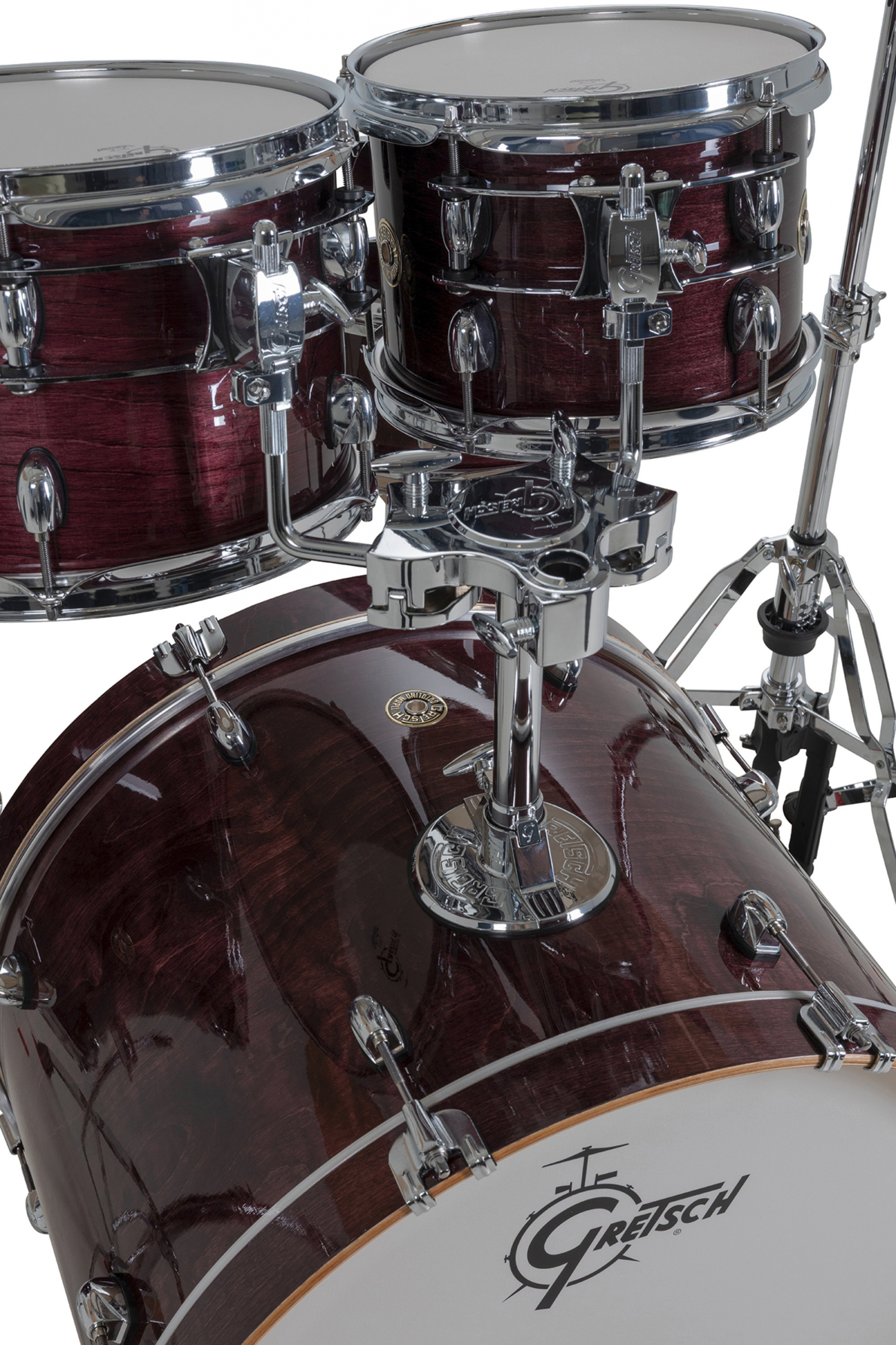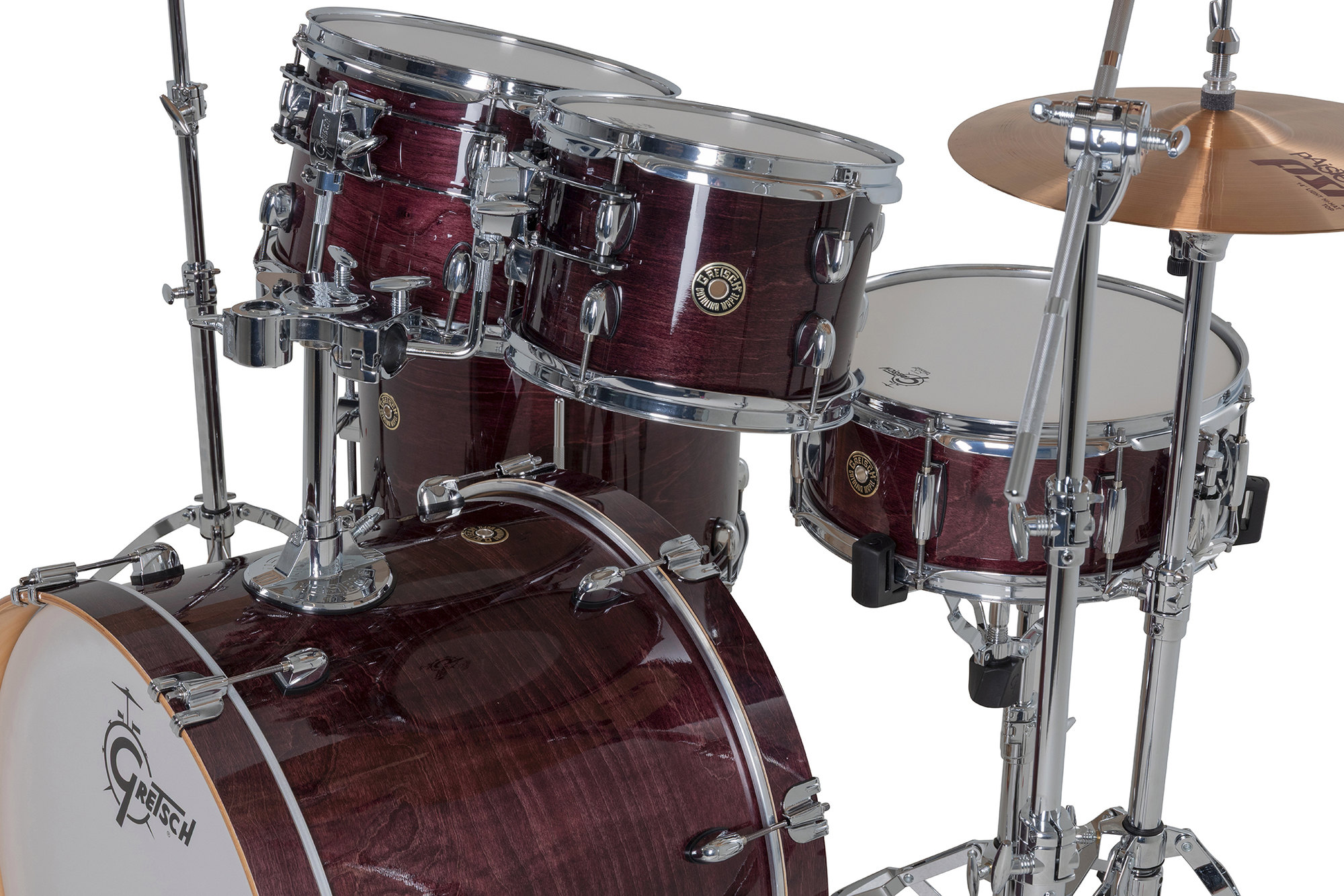 Семислойные корпуса из клена имеют типичную для Gretsch кромку под углом 30°, на которую опираются стабильные 2,3-миллиметровые стальные обручи. Тонкие 2-точечные "низкопрофильные" подвески томов и пластики Remo®, установленные в стандартной комплектации, придают барабанам фантастический и безошибочный аутентический звук.