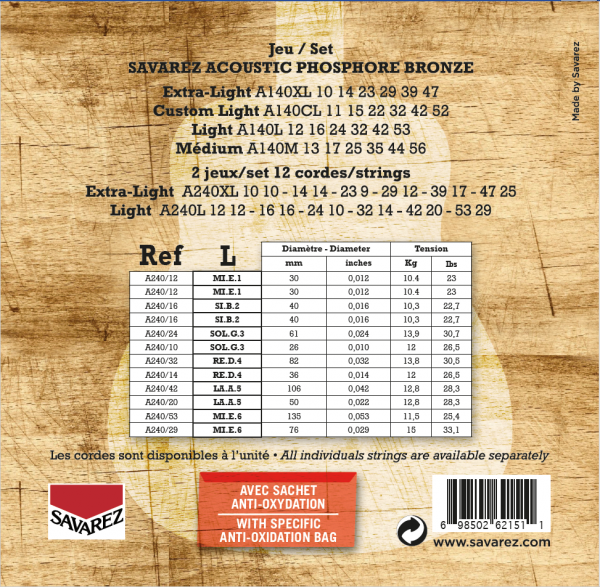 Струны Savarez A240L – струны для акустической гитары размером 012 – 053 от французского производителя Savarez. Комплект струн с закаленным сердечником из высокоуглеродистой стали и обмоткой из фосфорной бронзы. Струны отличаются чистыми, четкими и тёплыми тонами.