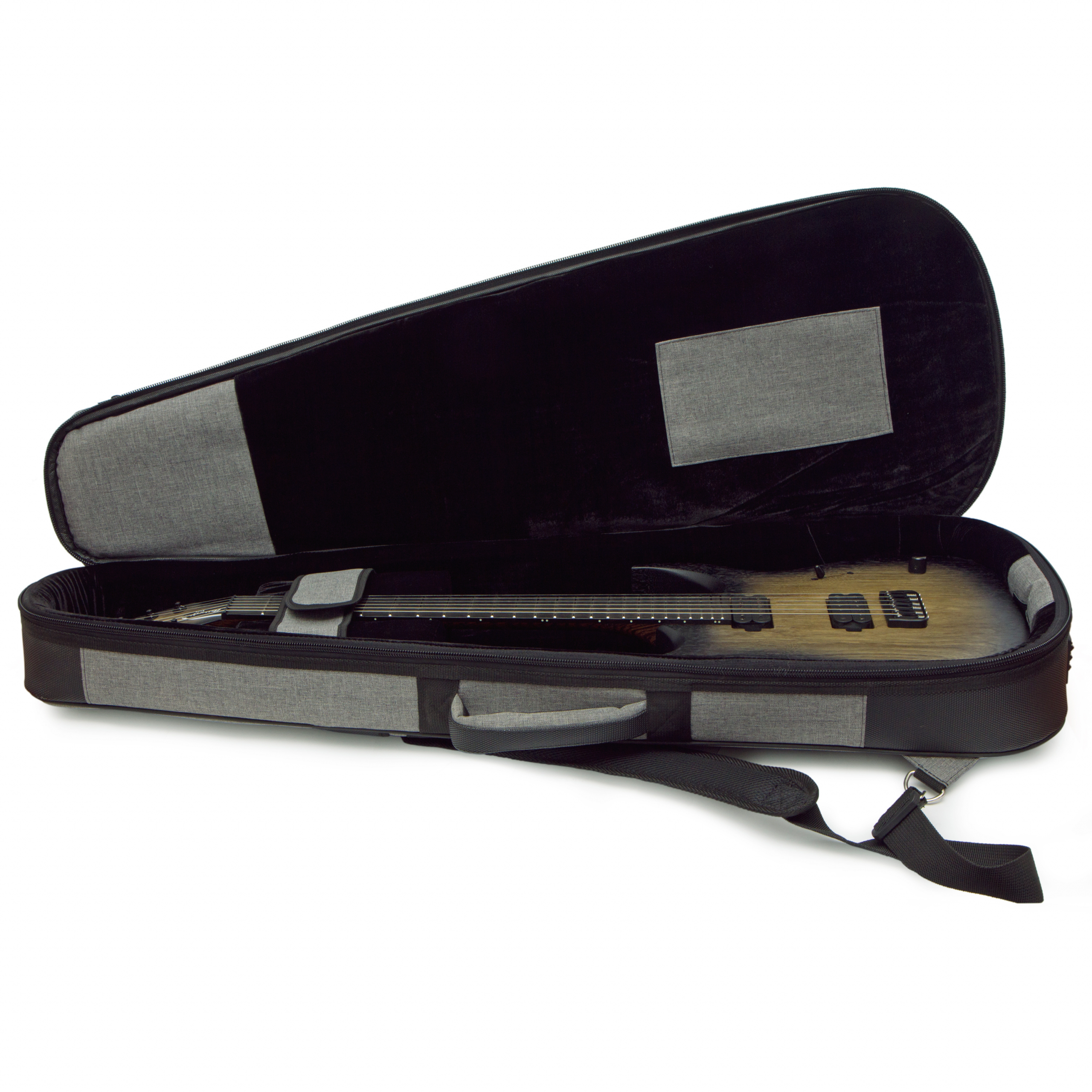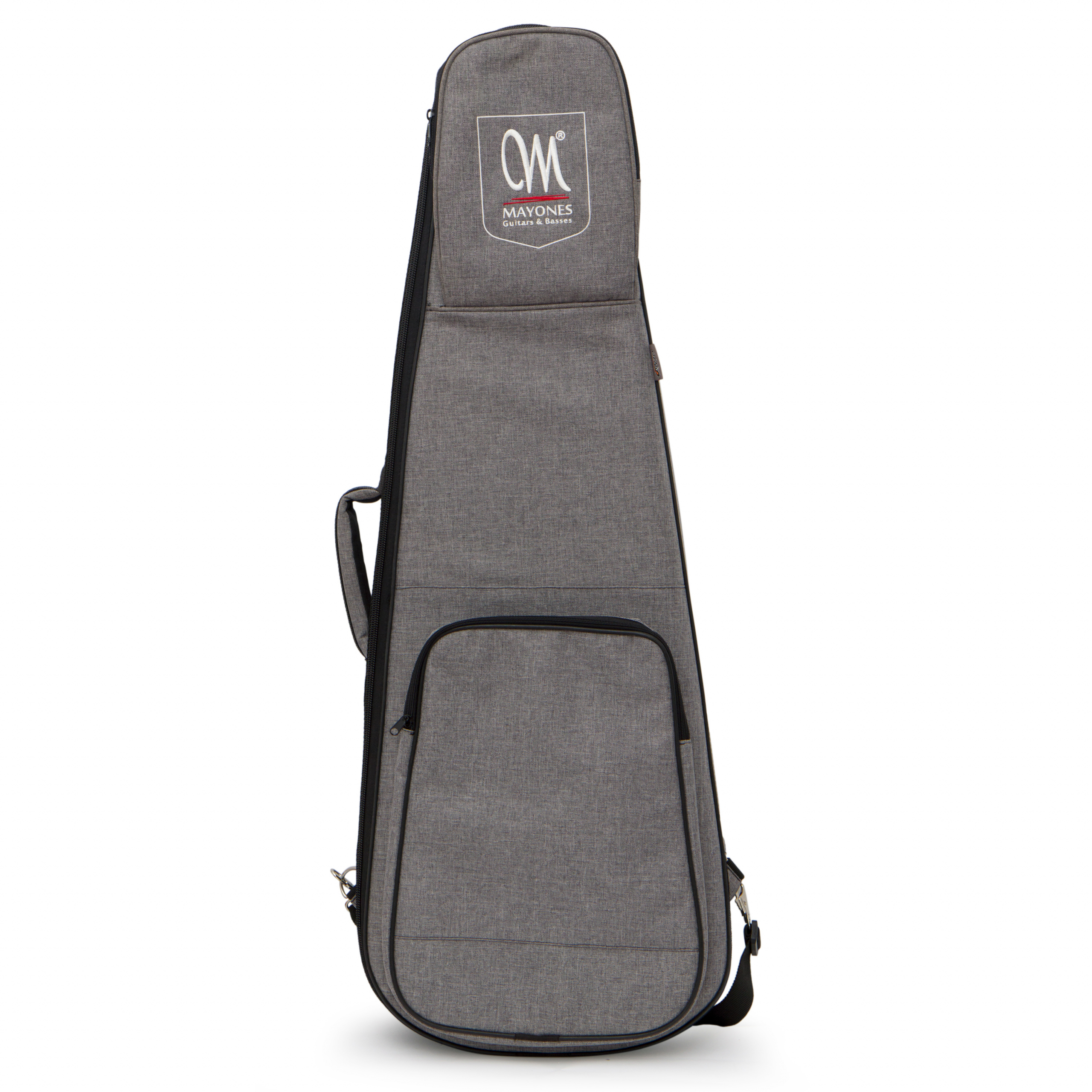 Гитара украшена черной металлической ручкой громкости и идет в комплекте с черными стреплоками Schaller для безопасности на сцене и мягким кейсом Mayones для безопасности в дороге.