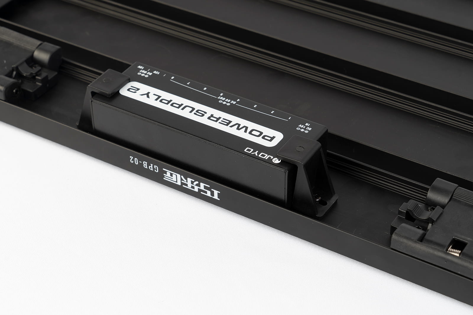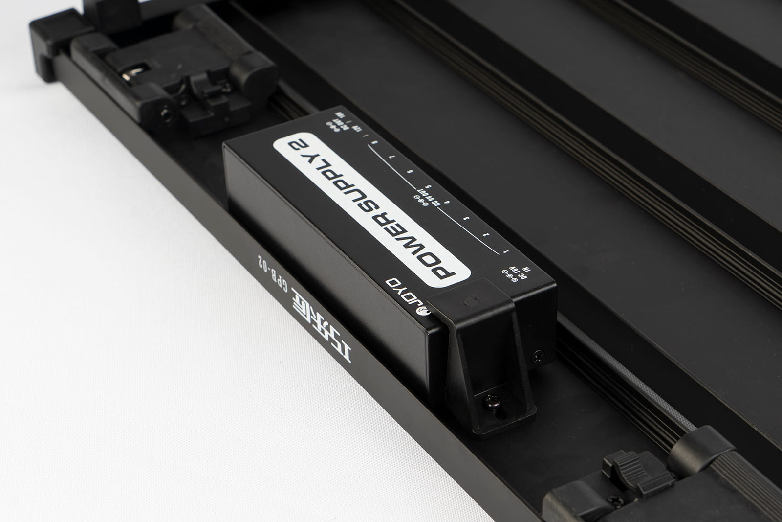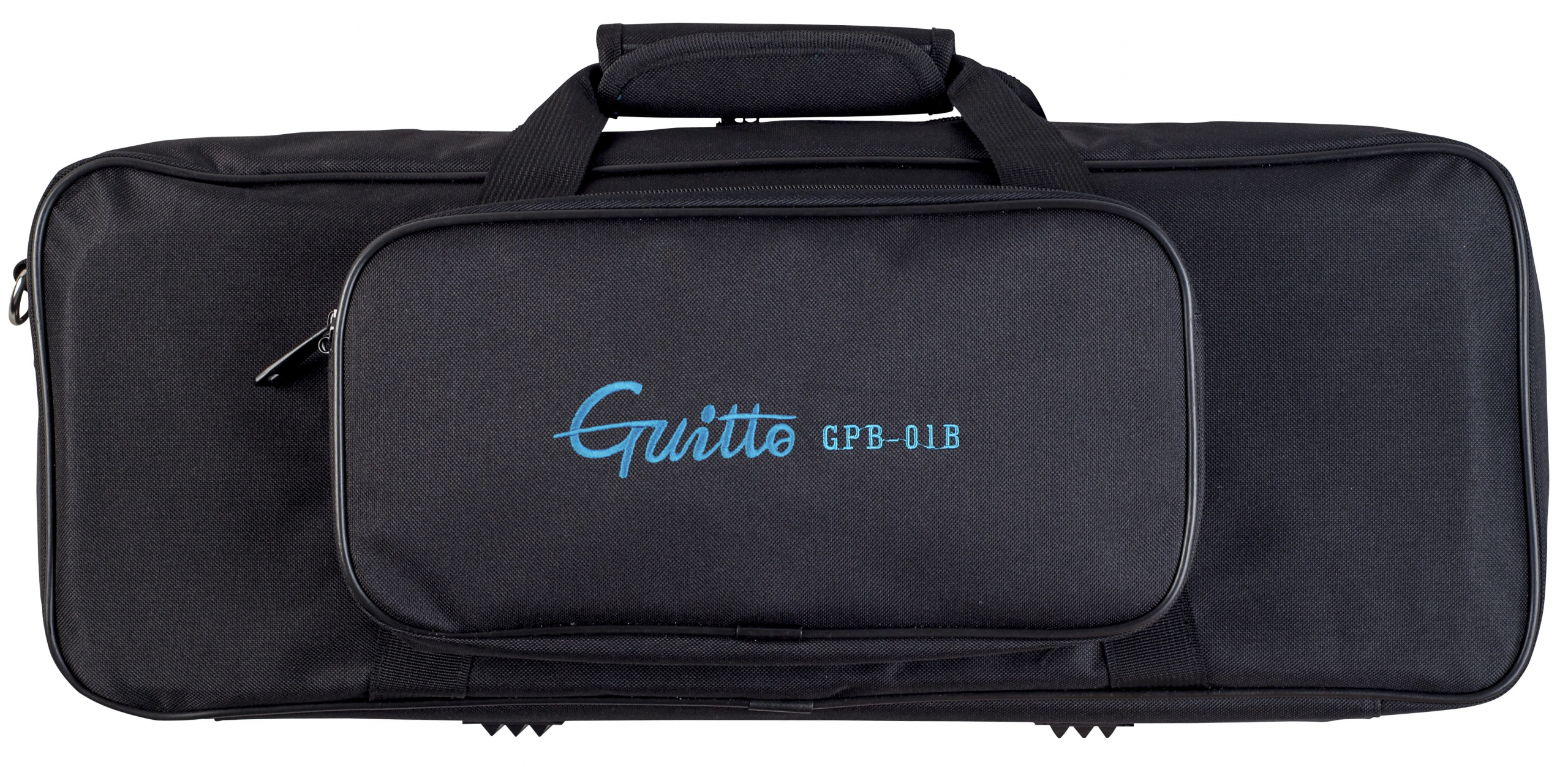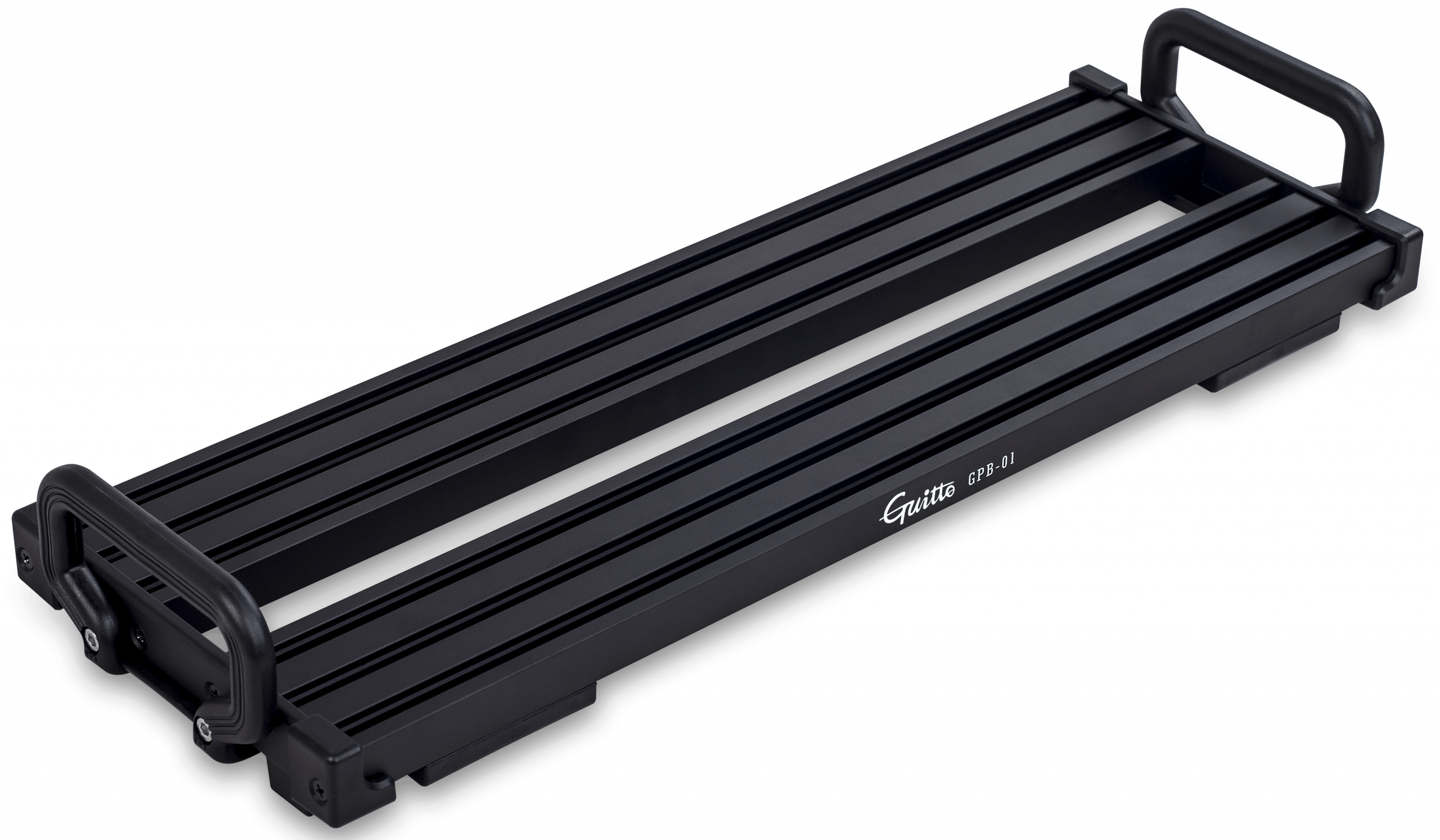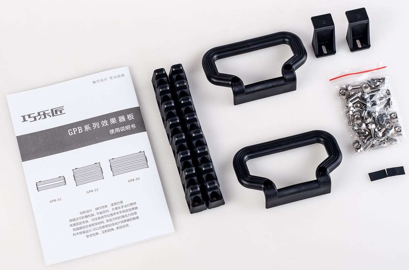 Под педалбордом расположена секция для удержания блока питания педалей (высота <35 мм, ширина <60 мм, длина <145 мм), что позволяет сделать коммутацию более эффективной и сэкономить полезную площадь. Инновационный механизм фиксации педалей предусматривает установку специальных крепежных блоков на рельсы педалборда для удержания стомпбоксов на месте. В комплекте с Guitto GPB-01 16 таких блоков (т.е. можно закрепить до 8 педалей), все необходимые для работы с педалбордом инструменты и удобный чехол.