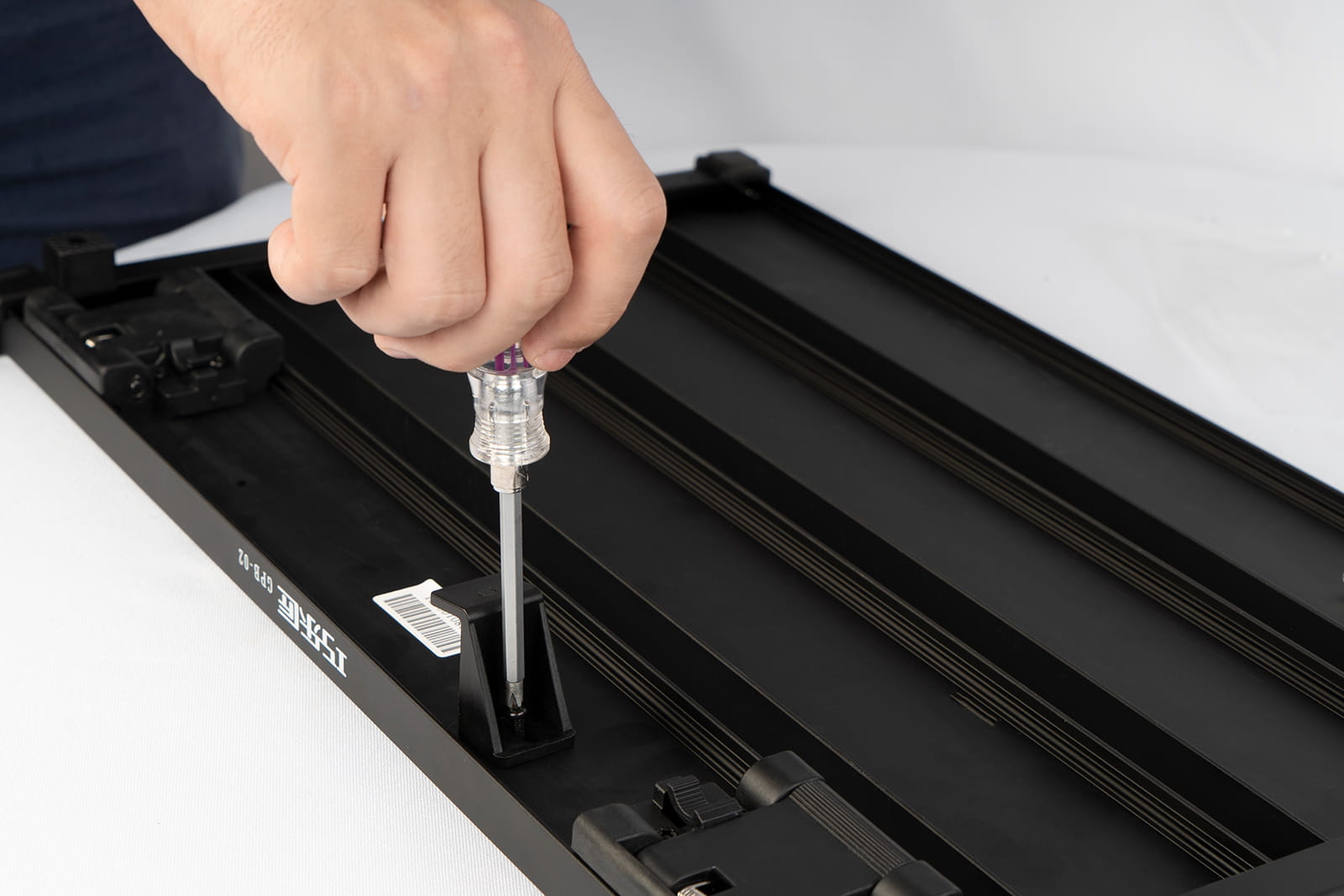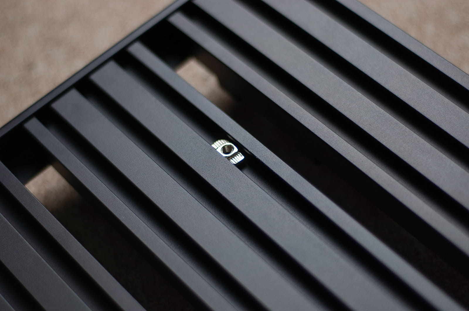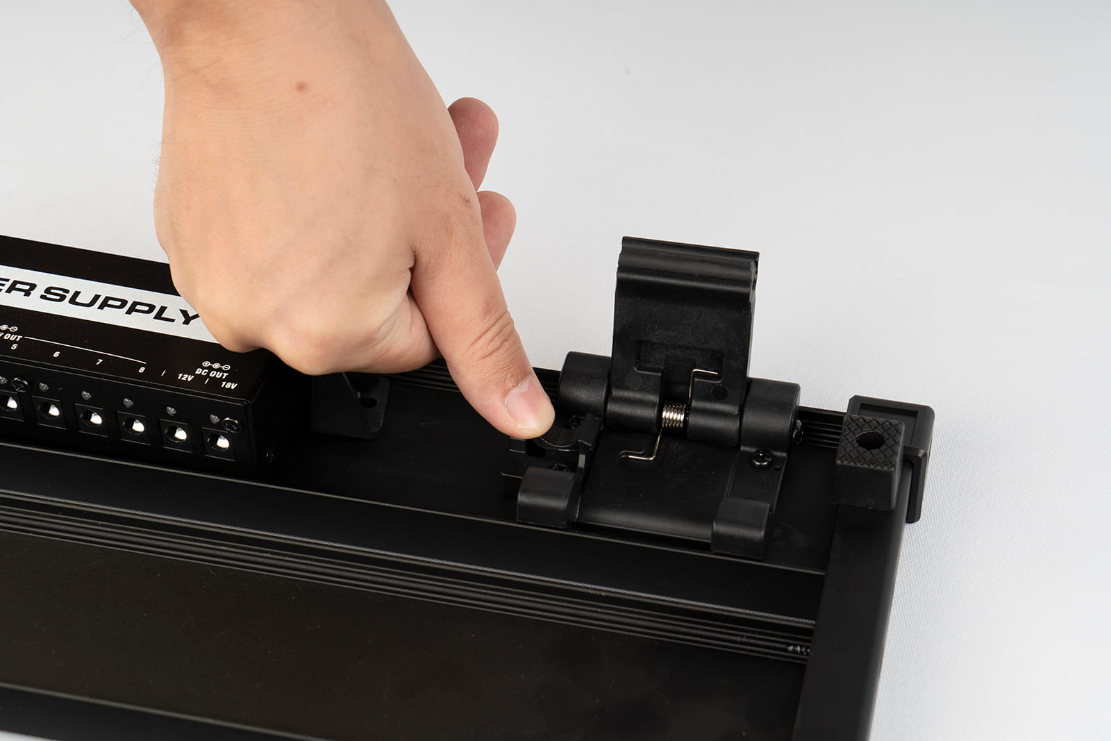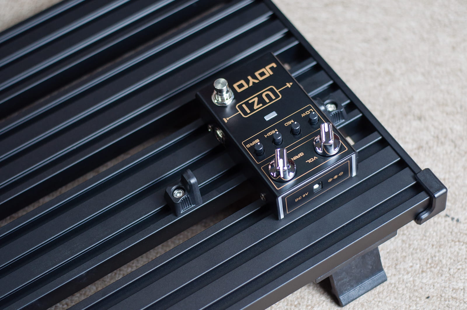 Под педалбордом расположена секция для удержания блока питания педалей (высота <35 мм, ширина <60 мм, длина <145 мм), что позволяет сделать коммутацию более эффективной и сэкономить полезную площадь. Инновационный механизм фиксации педалей предусматривает установку специальных крепежных блоков на рельсы педалборда для удержания стомпбоксов на месте. В комплекте с Guitto GPB-01 16 таких блоков (т.е. можно закрепить до 8 педалей), все необходимые для работы с педалбордом инструменты и удобный чехол.